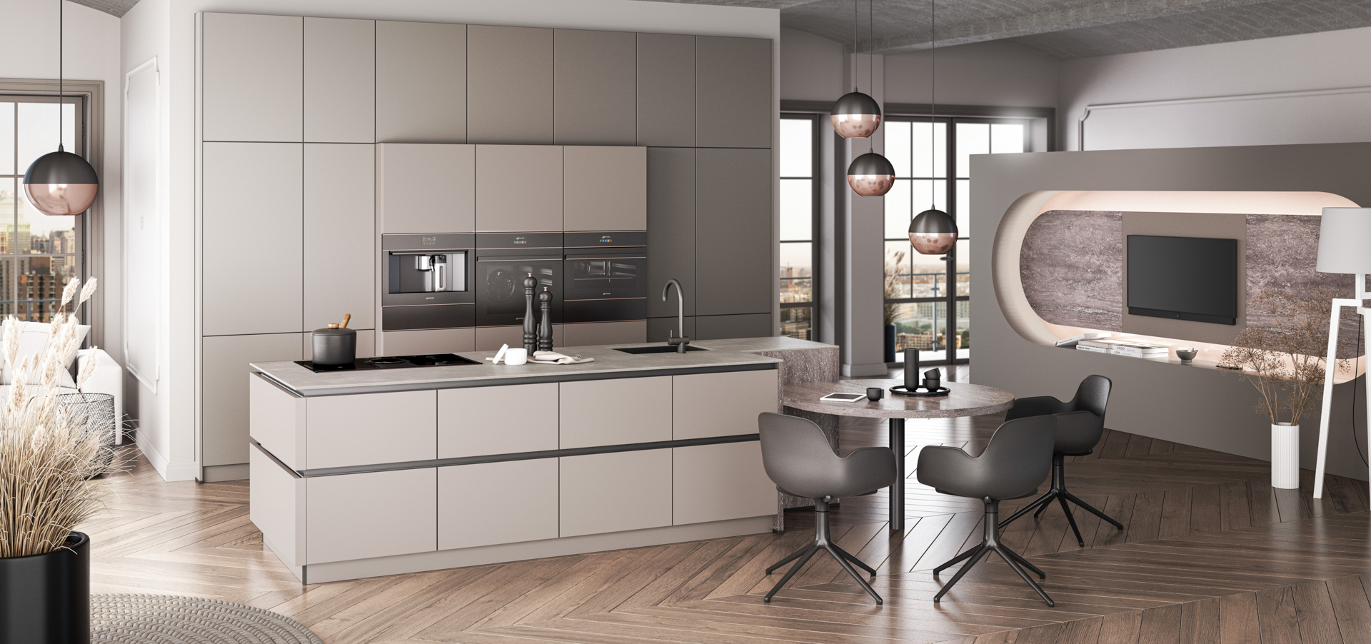 Diese warmen Grautöne bieten unzählige Gestaltungsmöglichkeiten und schaffen eine warme, einladende Atmosphäre. Erleben Sie die exklusive Schönheit von FEEL: Mit ihrer samtweichen Oberfläche lädt diese Küche zum Anfassen und Verweilen ein.